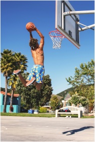 Shirtless man performing a basketball dunk at outdoor court in summer.