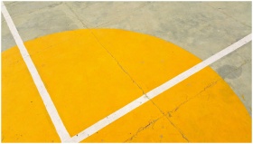 Close-up of a basketball court with yellow semicircle and white lines on concrete surface.
