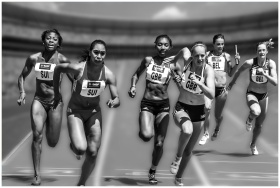 Female athletes in a high-stakes track race showca