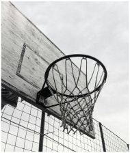 Monochrome shot of a basketball hoop against the sky, capturing the essence of outdoor sports.