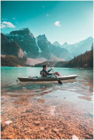A lone kayaker paddles on the serene waters of Moraine Lake with stunning mountain scenery in Banff, Alberta.