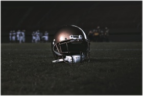 A football helmet placed on a grassy field during a nighttime game, capturing the spirit of sports.