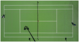 High-angle drone shot of a tennis match on a brigh