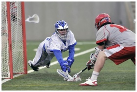 Dynamic scene of a lacrosse game with athletes in