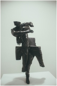 Abstract bronze sculpture displayed in an indoor museum setting.