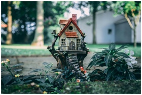A whimsical miniature house set amidst a lush fair