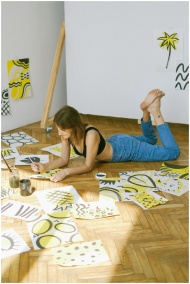 A woman artist creating abstract paintings in a su