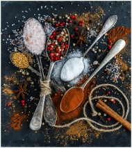 Assorted spices and seasonings arranged creatively on a dark surface, showcasing culinary art.