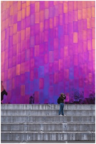 Photographer on stairs against vibrant wall in Seattle's modern architecture.