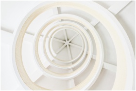 Explore this abstract spiral architecture with a modern minimalist design, featuring geometric white patterns.