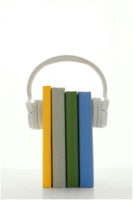 A stack of colorful books with headphones, symbolizing audio learning on a white background.