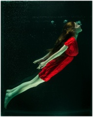 A woman in a red dress gracefully floats underwater, capturing a dreamlike essence.