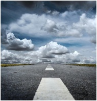 A straight road stretched toward a dramatic sky filled with fluffy clouds, creating a sense of journey.