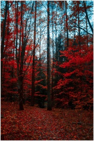 Stunning autumn forest with vivid red leaves highlighting the beauty of fall.