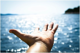 A hand reaching towards the sparkling sea, symboli