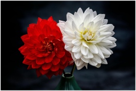 Close-up of vibrant red and white dahlias in a gre