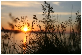 Peaceful view of grass silhouette with a vibrant sunset over water.