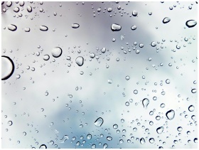 Raindrops on a window against a cloudy sky, creating a peaceful mood.