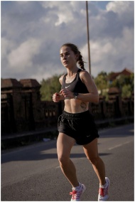 A female runner in athletic wear jogging on a stre