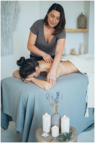 A serene spa setting with a therapist giving a back massage to a female client for relaxation.