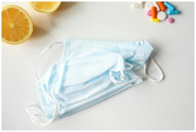A flat lay of face masks, lemons, and pills on a white surface, emphasizing health and protection.