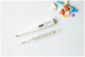 Digital and glass thermometers with colorful pills