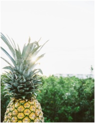 A ripe pineapple with morning sunbeams in a tropical garden setting.