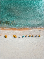 Aerial view of vibrant beach umbrellas on the shore with turquoise waves gently crashing.