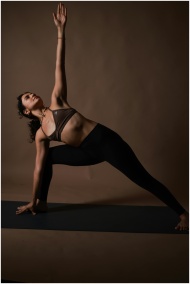 A woman performs a yoga pose on a mat with a neutral backdrop, highlighting her form.
