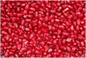 Close-up of vibrant red pomegranate seeds with a g