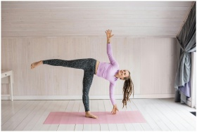 Woman practicing yoga pose indoors on a pink mat,