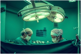 Surgeons in an operating room conducting a medical procedure under bright surgical lights.