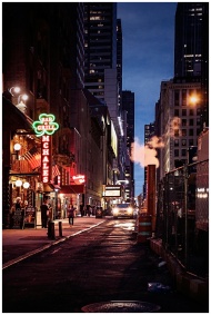 Atmospheric view of a bustling New York City street at night, featuring vibrant illuminated signs and urban life.