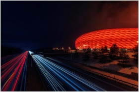 Capture of Allianz Arena illuminated at night with dynamic light trails.