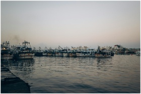 View of fishing boats docked at Ras El-Bar harbor during twilight.