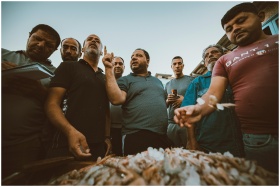 Group of men discussing at a bustling fish market in Ras El-Bar, Egypt, showcasing local culture.