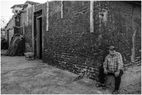 Black and white portrait of an elderly man sitting by a textured wall in a quaint Egyptian street.