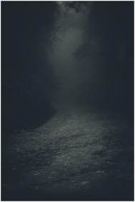 A mysterious and eerie forest pathway shrouded in mist and darkness, perfect for spooky themes.
