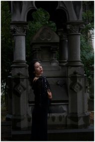 Elegant woman in black by a gothic mausoleum creat