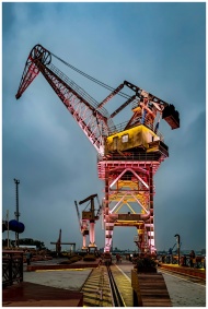A brightly lit industrial crane against a dramatic