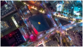 Drone shot capturing vibrant city lights and archi