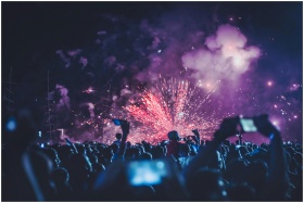 Dynamic crowd witnessing a vibrant fireworks display at a night festival, capturing the energy and joy of the event.