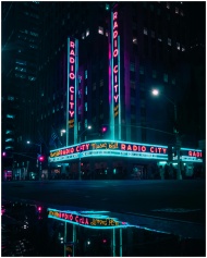 Vibrant neon lights of Radio City Music Hall illum