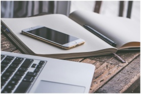 Open notebook with a smartphone and laptop on a wooden desk, creating a contemporary workspace vibe.