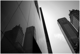 Low angle view of modern skyscrapers in a cityscape with reflections.