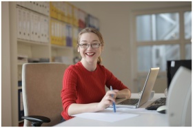Happy woman in red sweater working at office desk with laptop and pen, smiling at camera.