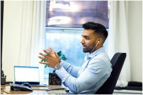 Adult male engaged in a virtual meeting using earphones in an office setting.