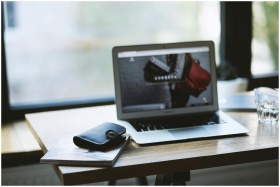 A contemporary workspace featuring a laptop and wallet on a wooden desk, near a window with natural light.