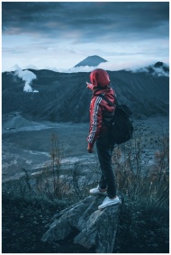 Person hiking in the misty mountains of East Java,