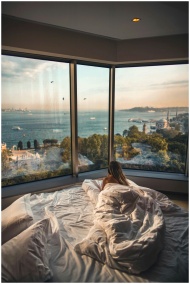Relaxing in a cozy hotel room with stunning views of the Bosphorus at sunset in Istanbul, Turkey.